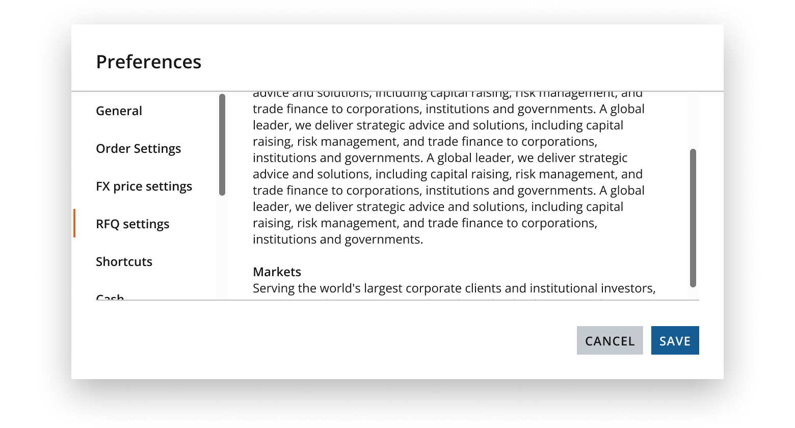 A preferences dialog allows you to display, group and navigate application preferences within a responsive modal dialog window. This pattern introduces guidelines to make the preferences dialog consistent and usable.